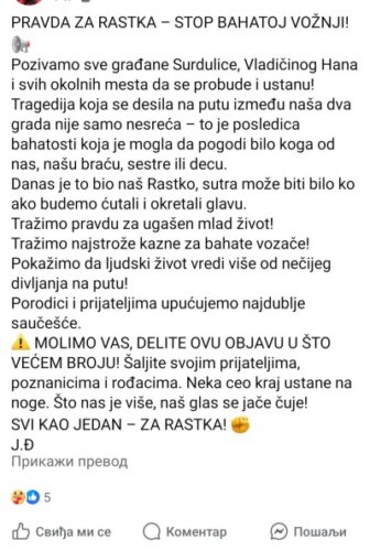 „Tragedija koja se dogodila na putu između naša dva grada nije samo nesreća – to je posledica bahatosti koja je mogla da pogodi bilo koga od nas, našu braću, sestre ili decu. Danas je to bio Rastko, sutra može biti bilo, ako budemo ćutali i okrenuli glavu,“ poručuju njegovi prijatelji.