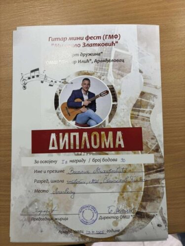 Na Gitar mini festu „Mihailo Zlatković“ održanom u Aranđelovcu, Veselin Mihajlović iz Vladičinog Hana osvojio je prvo mesto, uz mentorstvo profesora, Lazara Vukovića.