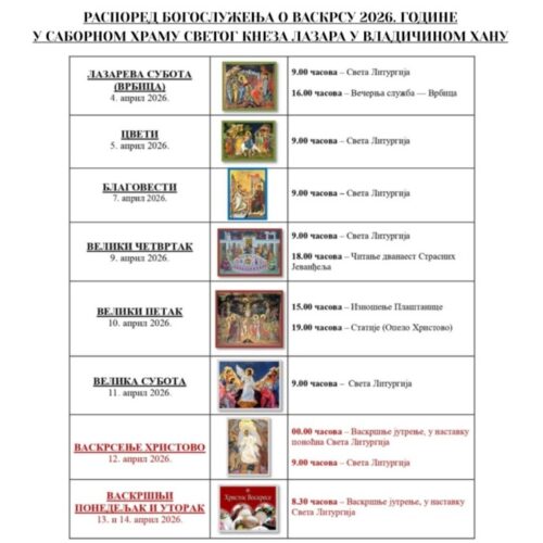 U susret najradosnijem hrišćanskom pravoslavnom prazniku, Vaskrsu, Crkvena Opština Vladičin Han objavila je raspored bogosluženja. Centralna bogosluženja, Vaskršnje jutrenje i ponoćna liturgija biće 12. aprila, u ponoć u gradskom hramu Kneza Lazara, a zatim na Vaskrs, u 9 časova.