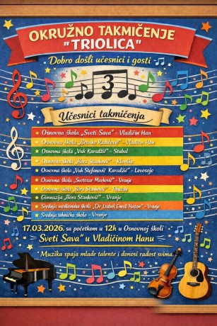 U Osnovnoj školi „Sveti Sava“ u Vladičinom Hanu danas se održava okružno takmičenje iz muzičke kulture „Triolica“. Učestvovaće predstvnici škola iz ovog mesta, Stubla, Vranja, Tibužda Levosoja i Klenika.