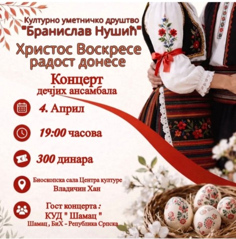 U subotu ove nedelje Kulturno umetničko društvo „Branislav Nušić“ za svoju vernu publiku prirediće tradicionalni Uskršnji koncert drčjih ansambala. Ove goodine u goste im dolazi KUD „Šamac“ iz istoimenog mesta iz Republike Srpske .