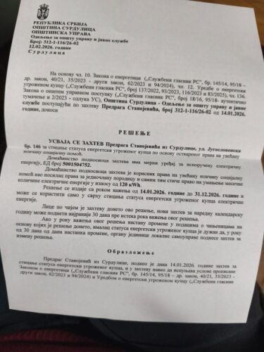 „U martu i aprilu sam vodila evodenciju i potrošeno je 45 kw kao što je i godinama unazad . Lepo ovde piše da njemu opština placa 120 kw a on trosi oko 50 kw …Zar treba da plati od socijale 55 hiljada pre ovog novog računa i da nema novca ni za hleb ? Šta kaže zakon ?“